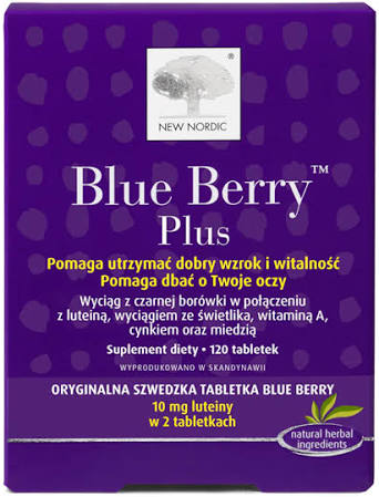 Blue Berry Plus to suplement diety w tabletkach zawierający w składzie wyciąg z czarnej borówki w połączeniu z luteiną, wyciągiem ze świetlika, witaminą A, miedzią i cynkiem.